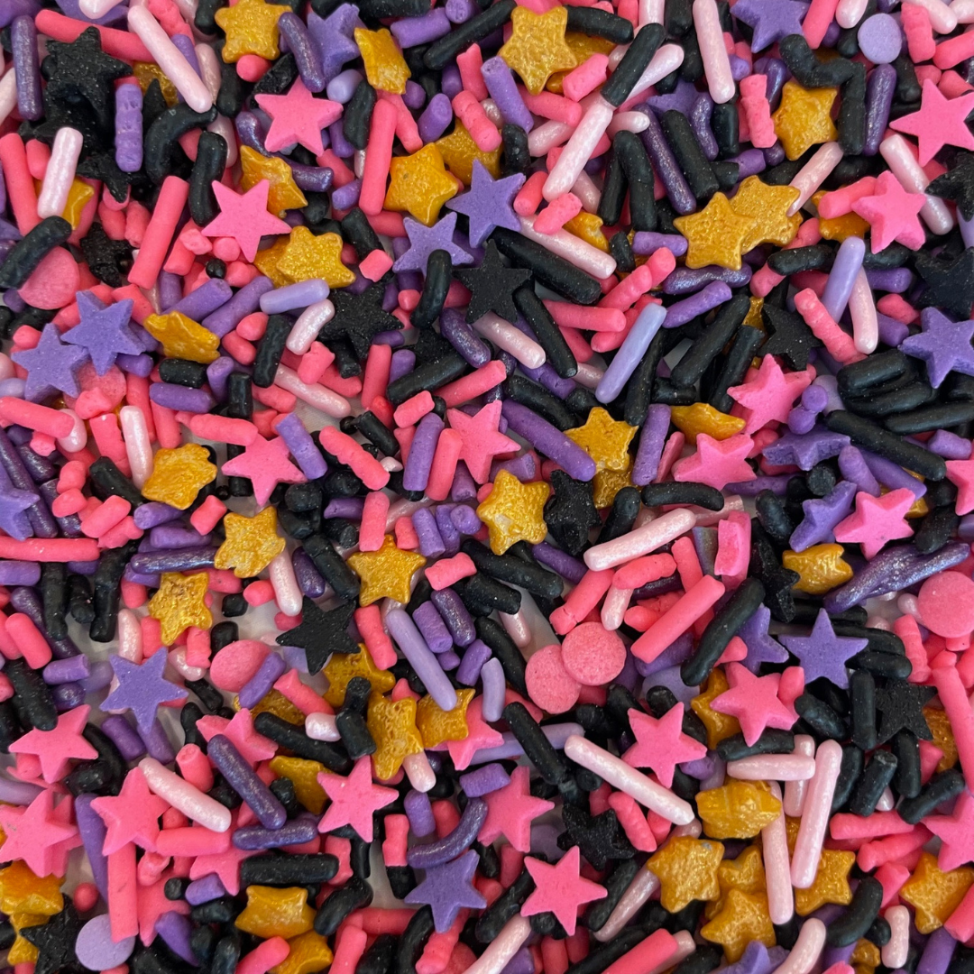 Top them off with the included battle-ready sprinkle blend of pink, purple, black, and gold - a tribute to the fierce energy of our favorite trio.