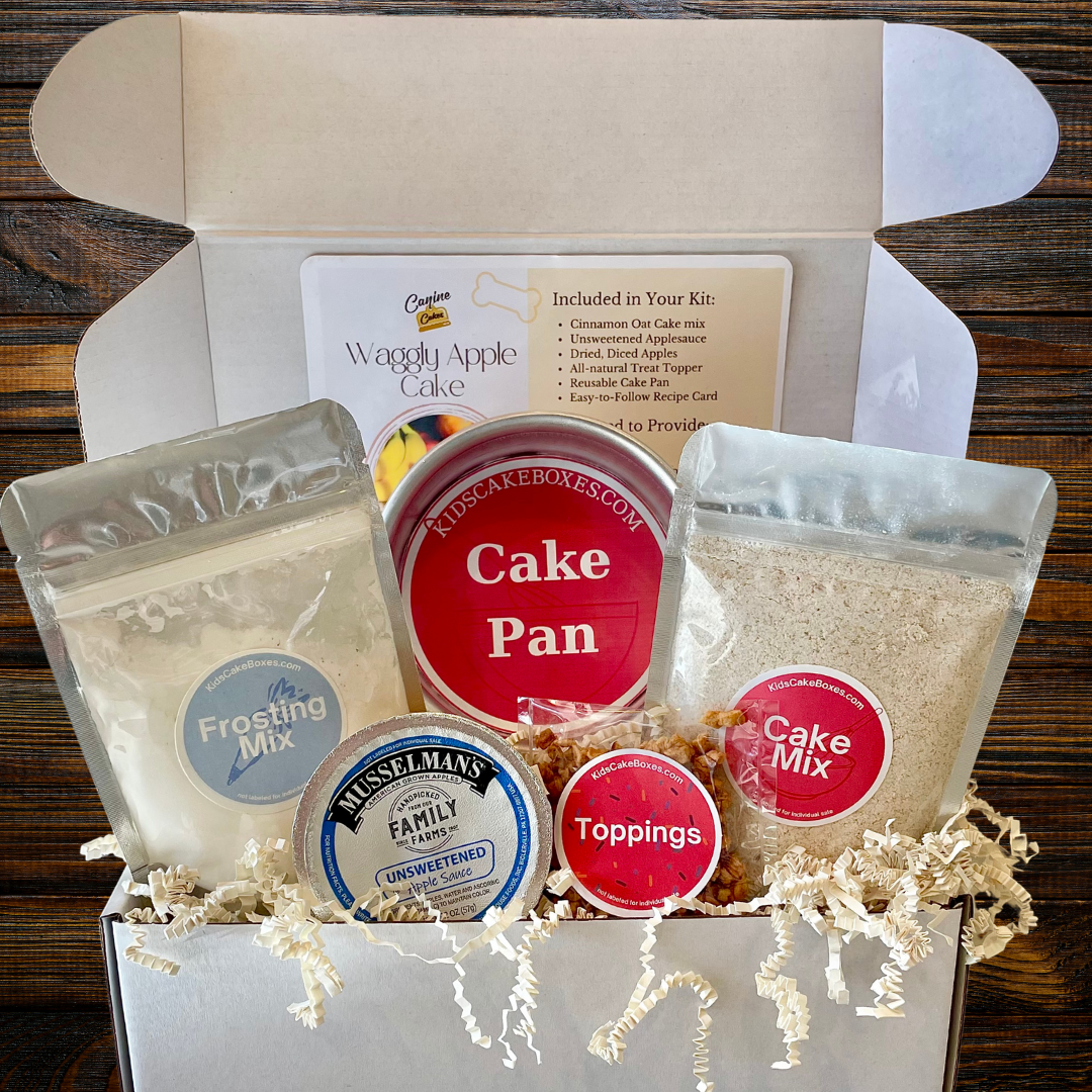 Happy wagging all around for your pup with our Waggly Apple cake baking kit. This kit creates a lip-licking, all-natural treat for your pup! You'll feel good baking this fabulous treat made with only veterinarian-approved ingredients (no wheat, corn, soy, sugar or preservatives). Celebrate your furry friend and bake memories with the whole family.
